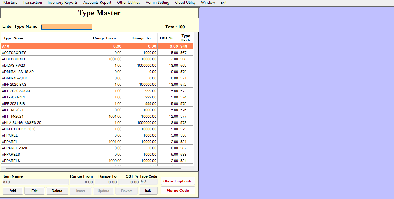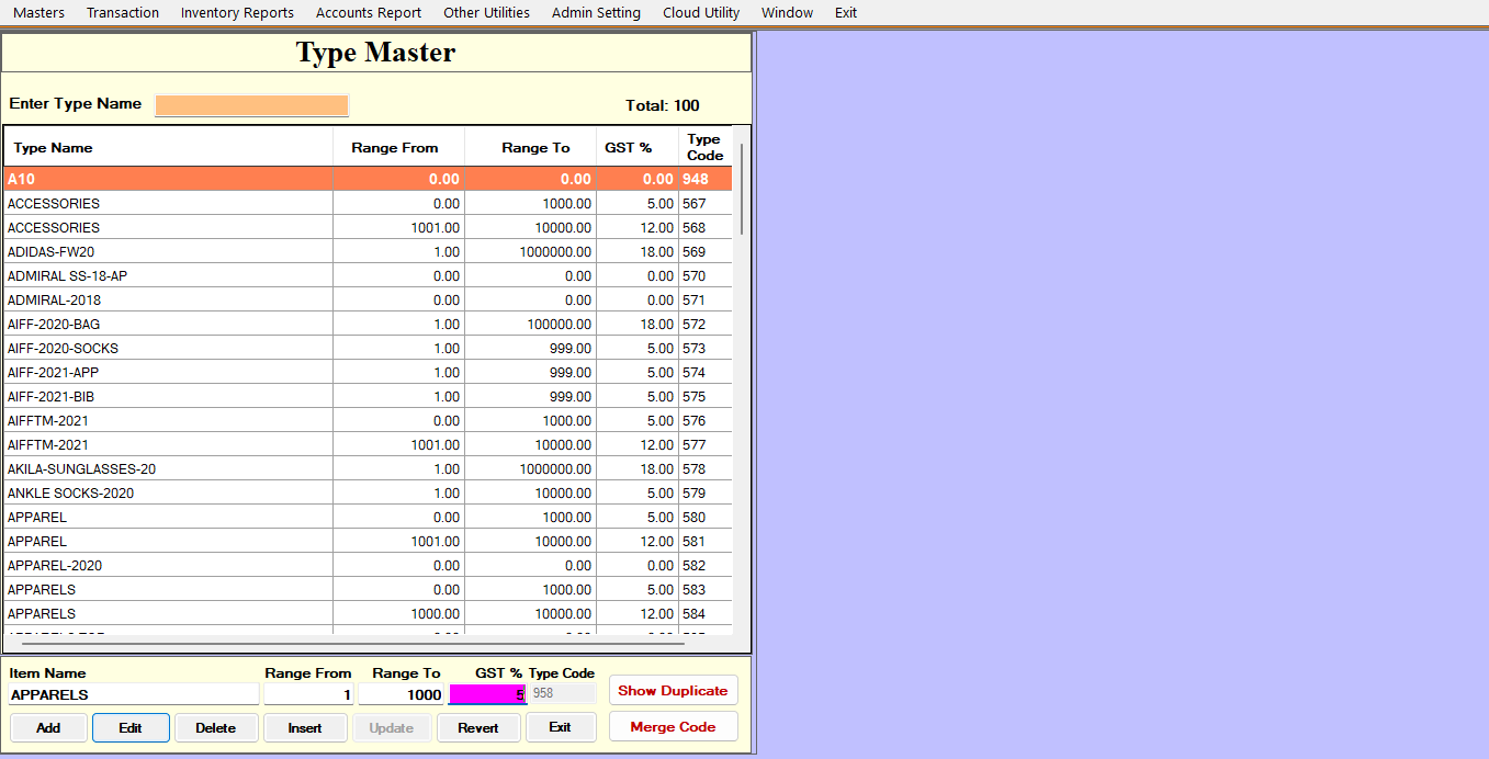 Type Name : The user will mention the Type name. Suppose , mention Type name 'APPAREL'.